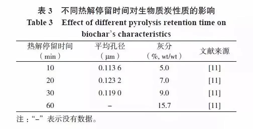生物質(zhì)炭具有復(fù)雜的孔隙結(jié)構(gòu),其孔徑大小決定其比表面積。而生物質(zhì)炭的孔徑大小與熱解停留時(shí)間也有關(guān)系。當(dāng)熱解停留時(shí)間為20~30 min 時(shí),生物質(zhì)炭的平均孔徑相對(duì)于停留時(shí)間10 min 時(shí)的孔徑尺寸提高了4.8%~8.5%(表3)?;曳趾恳矔?huì)隨著熱解停留時(shí)間的延長而增加。Tan 等分析結(jié)果表明熱解停留時(shí)間為20 min,生物質(zhì)炭的灰分含量為7.0% ;停留時(shí)間為60 min,其灰分含量增加至15.7%。這是由于熱解停留時(shí)間長,易于有機(jī)物質(zhì)揮發(fā)而殘留更多的灰分。