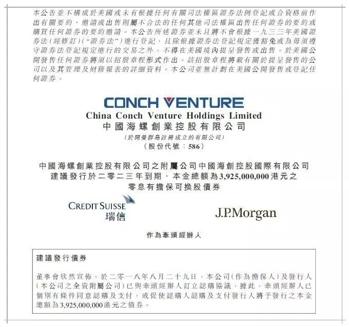 2018年8月30日凌晨,海螺創(chuàng)業(yè)抓住有利的市場機遇,選擇合適的發(fā)行窗口,成功發(fā)行了5年期39.25億港元零票息可轉換債券。