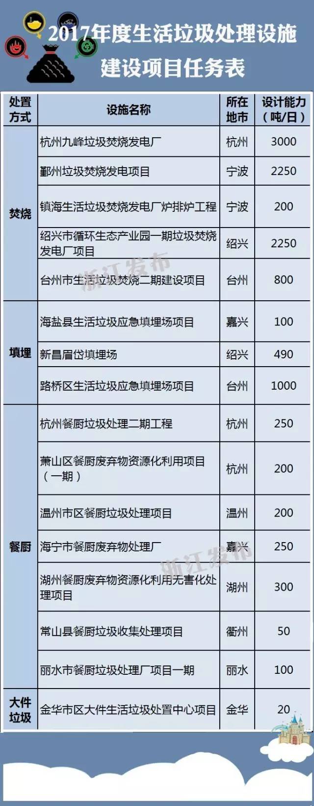 今年浙江將新建16個(gè)生活垃圾末端處置設(shè)施,新增日處理能力1100噸以上。目前16個(gè)生活垃圾末端處置設(shè)施已全部開(kāi)工建設(shè)。具體名單↓