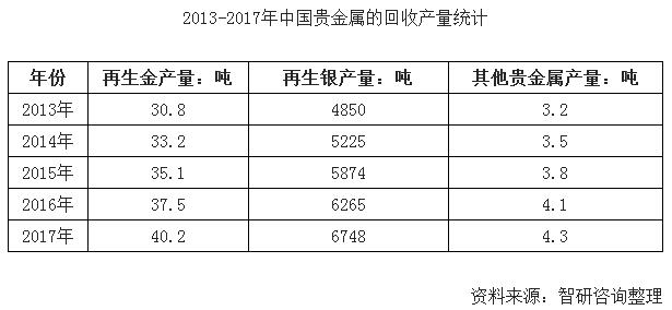近兩年,在我國(guó)廢舊回收體系不斷完善的基礎(chǔ)上,我國(guó)貴金屬回收產(chǎn)業(yè)不斷發(fā)展,回收量和回收及加工企業(yè)的收入也在不斷的增長(zhǎng)中,2016年我國(guó)再生金的產(chǎn)量達(dá)到了37.5噸,2017年增長(zhǎng)至40.2噸,同時(shí)再生金占我國(guó)黃金總產(chǎn)量的比例不斷提升,中國(guó)黃金協(xié)會(huì)的統(tǒng)計(jì)數(shù)據(jù)顯示,2016年和2017年我國(guó)黃金產(chǎn)量總量分別為453.5噸和426.1噸,再生金產(chǎn)量占比分別為8.27%和9.43%,同時(shí)相關(guān)企業(yè)的再生金銷售收入也從84.38億元增長(zhǎng)至101.30億元。而再生銀依然是我國(guó)回收量最大的貴金屬,2016年達(dá)到6265噸,2017年增長(zhǎng)至6265噸,相應(yīng)的收入分別為238.07億元和263.17億元。