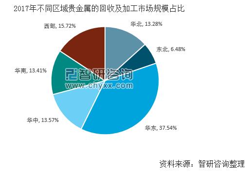 目前,國(guó)內(nèi)貴金屬的回收及加工需求市場(chǎng)主要集中在人口密集、經(jīng)濟(jì)發(fā)達(dá)的地區(qū)以及服務(wù)水平較高的各省一二線城市,存在一定的區(qū)域性特征。其中,華東地區(qū)市場(chǎng)需求最大,占全國(guó)比重達(dá)到37.54%。其次是華中、華南和華北地區(qū),總的來(lái)看,這幾個(gè)地區(qū)基礎(chǔ)工業(yè)發(fā)展較為完善,含廢舊貴金屬的產(chǎn)品消費(fèi)量大,廢舊貴金屬產(chǎn)業(yè)具有較大的想象空間。但是從整個(gè)產(chǎn)業(yè)的發(fā)展完善的程度來(lái)看,北京地區(qū)已經(jīng)基本形成了完善的回收加工體系,上海地區(qū)的緊隨其后,華東和華南的部分區(qū)域依然以小作坊為主,產(chǎn)業(yè)發(fā)展環(huán)境急需規(guī)范。