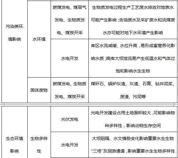 4、生態(tài)環(huán)境影響:煤礦開采造成采空塌陷區(qū),導(dǎo)致土壤龜裂,山體滑坡,水資源流失,耕地毀壞;光電開發(fā)占用土地面積較大,影響動(dòng)物生存空間,對(duì)物種多樣性有一定影響;水電開發(fā)造成水文情勢(shì)變化,影響水生生物“三場(chǎng)”及洄游通道,影響水生生物多樣性;風(fēng)電開發(fā)風(fēng)機(jī)可能對(duì)鳥類的覓食、休憩和遷飛等活動(dòng)行為產(chǎn)生一定的不利影響。