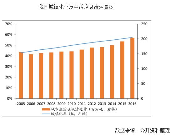 隨著城鎮(zhèn)化進(jìn)程加速,生活垃圾處理需求保持較快增長(zhǎng),垃圾清運(yùn)量持續(xù)增長(zhǎng),處理能力相對(duì)不足。2005年-2017年我國(guó)城鎮(zhèn)化率從42.99%提升至58.52%,城鎮(zhèn)化的快速發(fā)展和人民生活水平的日益提高使得我國(guó)城鎮(zhèn)生活垃圾清運(yùn)量持續(xù)較快增長(zhǎng)。根據(jù)國(guó)家新型城鎮(zhèn)化規(guī)劃,到2020年,城鎮(zhèn)化率將提升至60%左右。伴隨城鎮(zhèn)化持續(xù)推進(jìn)以及人民。生活水平提升推動(dòng),預(yù)計(jì)城市生活垃圾產(chǎn)生及清運(yùn)量將持續(xù)。