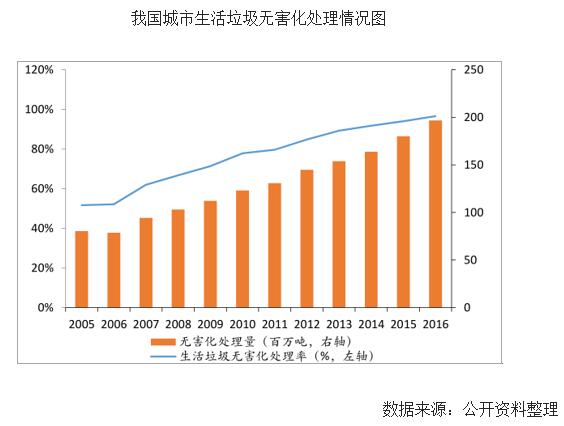 2017年1月,發(fā)改委頒布《“十三五”全國(guó)城鎮(zhèn)生活垃圾無(wú)害化處理設(shè)施建設(shè)規(guī)劃》。規(guī)劃提出,要加快垃圾無(wú)害化化處理設(shè)施建設(shè),到2020年底,直轄市、計(jì)劃單列市和省會(huì)城市(建成區(qū))生活垃圾無(wú)害化處理率達(dá)到100%;其他設(shè)市城市、縣城(建成區(qū))、建制鎮(zhèn)的生活垃圾無(wú)害化處理率分別達(dá)到95%以上、80%以上和70%以上。