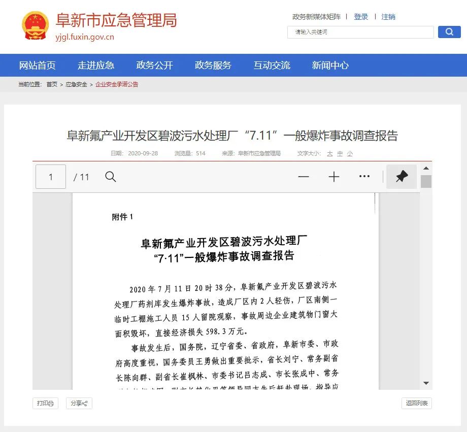 文章導讀近日,阜新市應急管理局已經(jīng)發(fā)布了《阜新氟產(chǎn)業(yè)開發(fā)區(qū)碧波污水處理廠“7.11”一般爆炸事故調(diào)查報告》(下稱《報告》)。結(jié)果顯示,爆炸的直接原因是該污水廠違規(guī)使用氯酸鈉催化劑,在儲存時與赤砂糖發(fā)生化學反應發(fā)生爆炸,爆炸現(xiàn)場形成的沖擊波相當1.0-1.5tTNT當量。還記得去年7月12日,遼寧省阜...