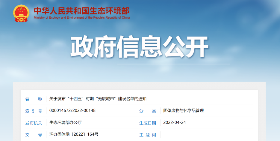 關(guān)于發(fā)布“十四五”時(shí)期“無廢城市”建設(shè)名單的通知各省、自治區(qū)、直轄市生態(tài)環(huán)境廳(局): 為落實(shí)《中共中央 國務(wù)院關(guān)于深入打好污染防治攻堅(jiān)戰(zhàn)的意見》和《“十四五”時(shí)期“無廢城市”建設(shè)工作方案》(以下簡稱《工作方案》),我部會同有關(guān)部門,根據(jù)各省份推薦情況,綜合考慮城市基礎(chǔ)條件、工作積極性和國家相關(guān)重大...