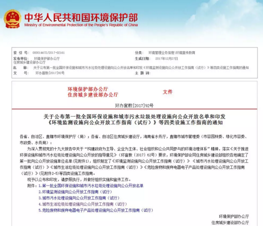 近日環(huán)保部發(fā)布了關于公布第一批全國環(huán)保設施和城市污水垃圾處理設施向公眾開放名單和印發(fā)《環(huán)境監(jiān)測設施向公眾開放工作指南(試行)》等四類設施工作指南的通知。 包括29個垃圾處理設施,其中垃圾焚燒設施21個,垃圾填埋設施6個,餐廚垃圾處理設施1個,滲濾液處理設施1個,分布于全國27個省、直轄市和自治區(qū),聯(lián)...
