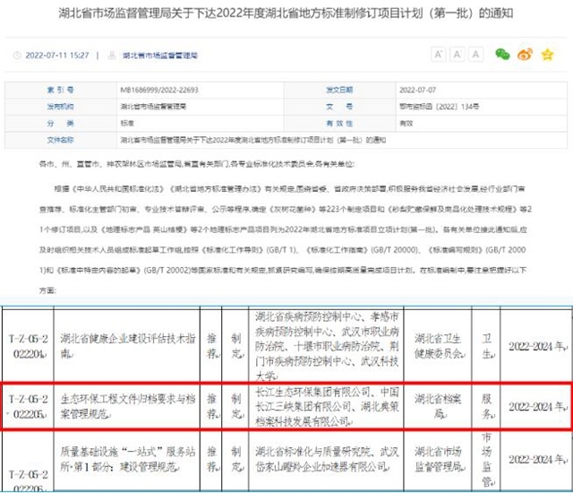 近日,湖北省市場監(jiān)督管理局印發(fā)關(guān)于下達(dá)2022年度湖北省地方標(biāo)準(zhǔn)制修訂項目計劃(第一批)的通知,長江環(huán)保集團(tuán)牽頭主編的《生態(tài)環(huán)保工程文件歸檔要求與檔案管理規(guī)范》成功入選2022年湖北省地方標(biāo)準(zhǔn)項目立項計劃(第一批),這是公司成立以來首次牽頭主編的省級地方標(biāo)準(zhǔn)?!逗笔∈袌霰O(jiān)督管理局關(guān)于下達(dá)2022年...