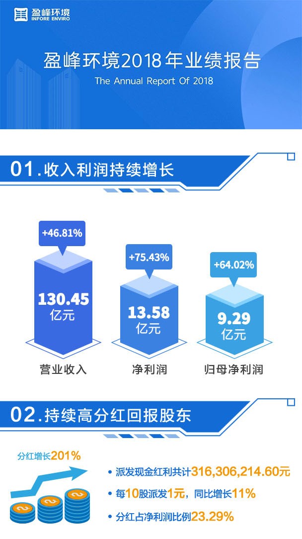 盈峰環(huán)境4月19日最新公布的2018年年報顯示,其營業(yè)收入130億元,同比增長46.81%;歸屬于上市公司股東的凈利潤9.29億元,同比增長64.02%?;久抗墒找?.41元。公司最新分配方案為每10股派發(fā)股息人民幣1元,股息率1.32%。具體詳情如下: