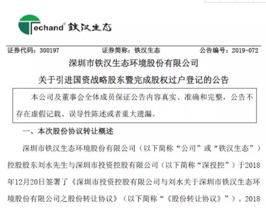近日,鐵漢生態(tài)發(fā)布公告稱,公司關于引進國資戰(zhàn)略股東事項已完成股權過戶登記。權益變動后,劉水先生持有上市公司股權的比例由35.73%下降至30.73%,公司的控股股東、實際控制人未發(fā)生變化。近日,鐵漢生態(tài)發(fā)布公告稱,公司關于引進國資戰(zhàn)略股東事項已完成股權過戶登記。于2019年4月30日收到中國證券登記...