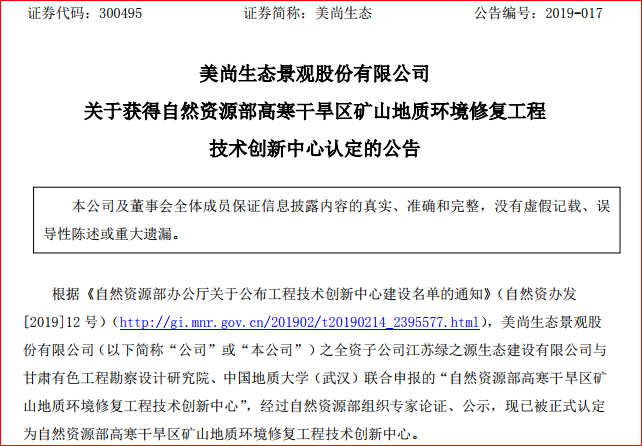 2019年2月18日,美尚生態(tài)景觀股份有限公司(簡(jiǎn)稱“美尚生態(tài)”)發(fā)布公告,公司全資子公司江蘇綠之源生態(tài)建設(shè)有限公司與甘肅有色工程勘察設(shè)計(jì)研究院、中國(guó)地質(zhì)大學(xué)(武漢)聯(lián)合申報(bào)的“自然資源部高寒干旱區(qū)礦山地質(zhì)環(huán)境修復(fù)工程技術(shù)創(chuàng)新中心”,經(jīng)過(guò)自然資源部組織...