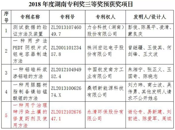 近日,湖南省專利局公示2018年度湖南專利獎(jiǎng)評審結(jié)果,永清環(huán)保發(fā)明專利《一種用于治理砷污染土壤的修復(fù)藥劑及使用方法》(專利號:ZL201210267647.1)獲湖南省專利獎(jiǎng)三等獎(jiǎng)。 本發(fā)明的目的在于克服現(xiàn)有技術(shù)的不足,創(chuàng)新提供一種原料來源廣泛、制備簡單、操作使用方便、效率高、治理效果好的,用于治理...