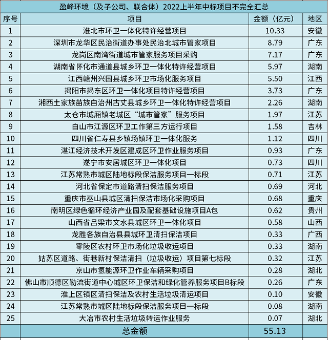 2022年上半年,國內(nèi)環(huán)衛(wèi)市場依舊風云變幻。既頻頻掉落10億級項目,又有環(huán)衛(wèi)與物業(yè)的新老玩家之爭,更有40進1、16進1、10進1等“奪標戰(zhàn)”引關(guān)注。而就在激烈的交鋒中,盈峰環(huán)境作為作為頭部環(huán)衛(wèi)企業(yè)之一,亦有著搶眼表現(xiàn)。 據(jù)環(huán)保在線不完全統(tǒng)計,截至6月底,盈峰環(huán)境中標二十余個...