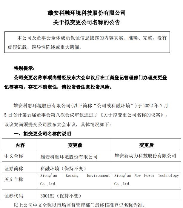2022年7月5日,雄安科融環(huán)境科技股份有限公司發(fā)布《關(guān)于擬變更公司名稱的公告》。 科融環(huán)境擬更名為“雄安新動力科技股份有限公司”,證券簡稱不變,證券代碼不變。(公司中文全稱以市場監(jiān)督管理部門最終核準登記名稱為準) 科融環(huán)境表示,更名原因在于公司自2010年IPO以來,業(yè)務從...