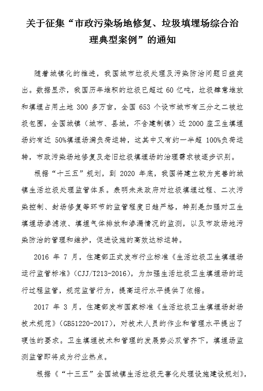 關(guān)于征集“垃圾分類優(yōu)秀模式案例”的通知2016年12月,國家主席習(xí)近平在中央財(cái)經(jīng)領(lǐng)導(dǎo)小組第十四次會議中強(qiáng)調(diào),要加快建立分類投放、分類收集、分類運(yùn)輸、分類處理的垃圾處理系統(tǒng);形成以法治為基礎(chǔ)、政府推動、全民參與、城鄉(xiāng)統(tǒng)籌、因地制宜的垃圾分類制度;普遍推行垃圾分類制度,努力提高垃圾分類制度覆蓋范圍。20...